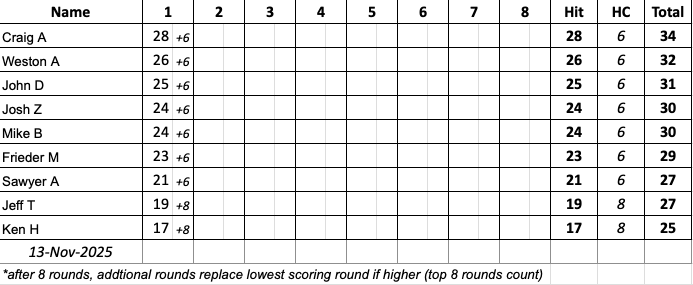 Wednesday night 5-stand league. 2 rounds per night. Top 8 rounds count. 8 rounds to qualify.